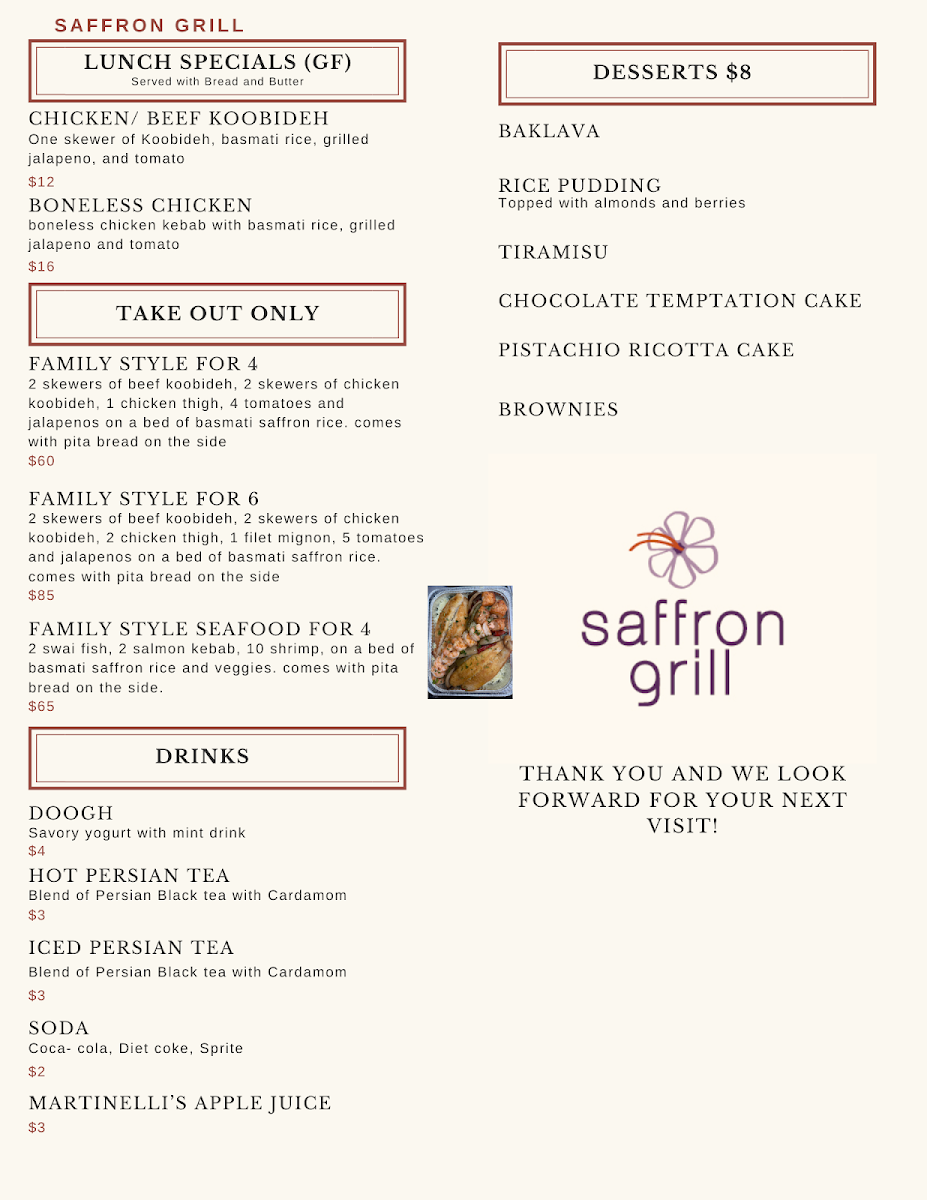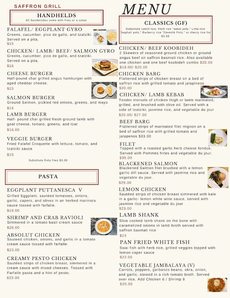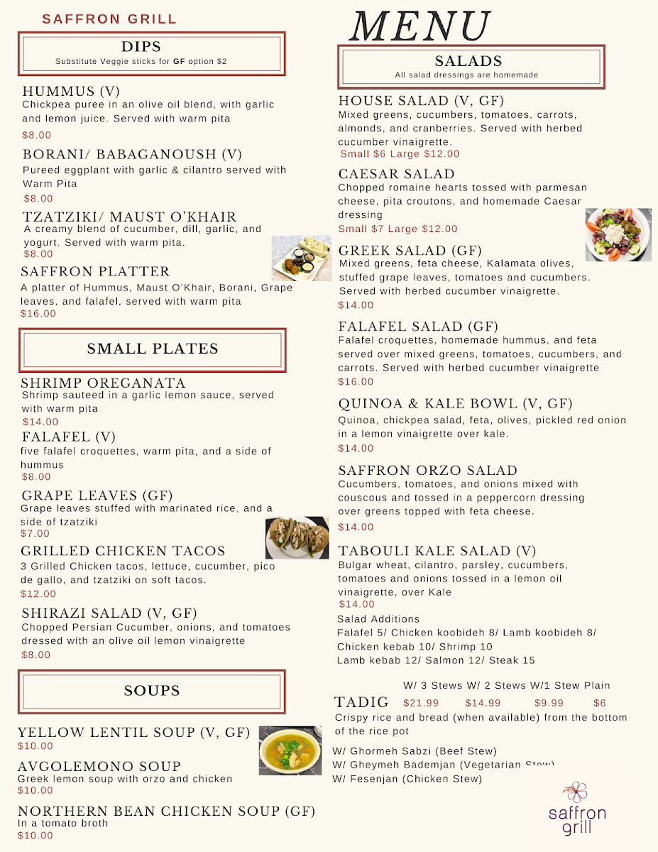 At Saffron Grill, the menu is a joyful celebration of traditional Persian flavors. Start with the Hummus ($6.99) or the Maust O Khiar ($5.99), both of which capture the essence of freshness and flavor. The showstoppers, however, are the succulent kebabs. The Chicken Barg ($13.00) and Beef Soltani offer expertly grilled meats marinated to perfection, while the Falafel Bowl ($15.99) tantalizes with its crispy exterior and soft, flavorful interior. For those craving something unique, don’t miss out on Tadig, a beloved Persian crispy rice dish available in various combinations with stews like Tadig 2 Stews ($14.99) and Tadig 3 Stews ($21.99) that promise to delight your taste buds.